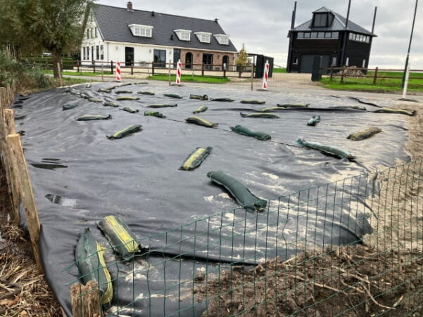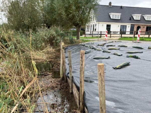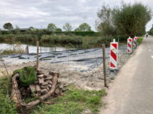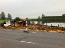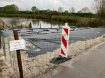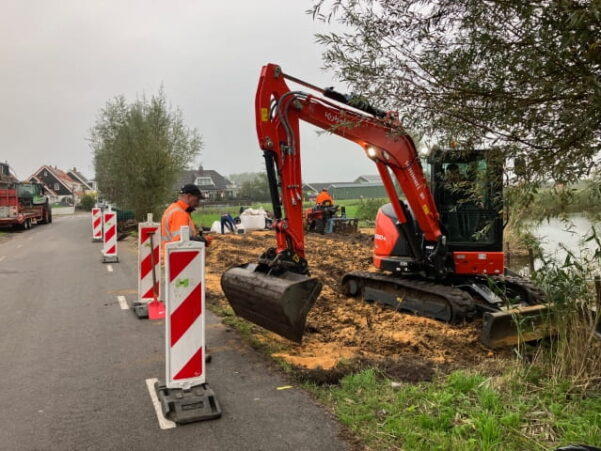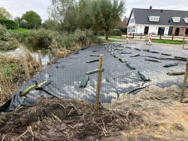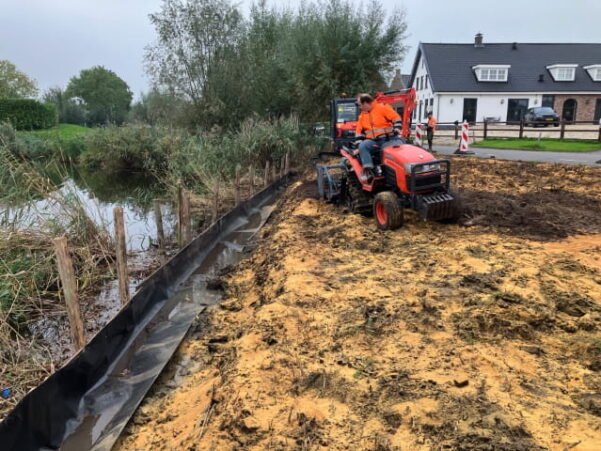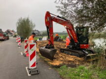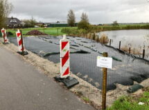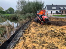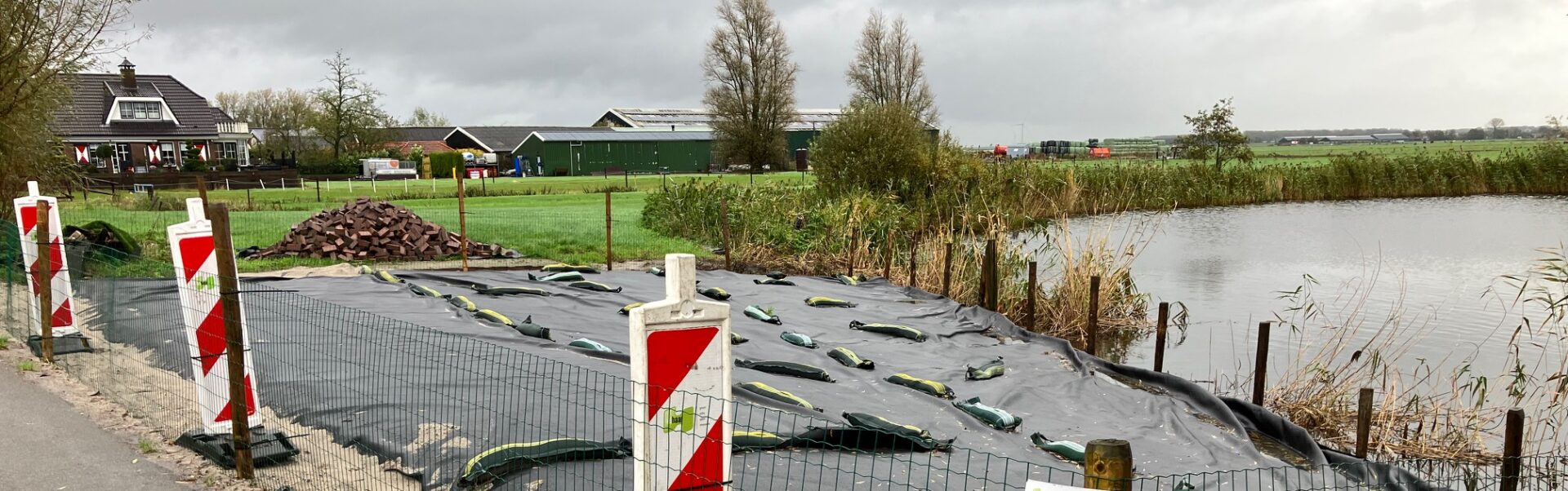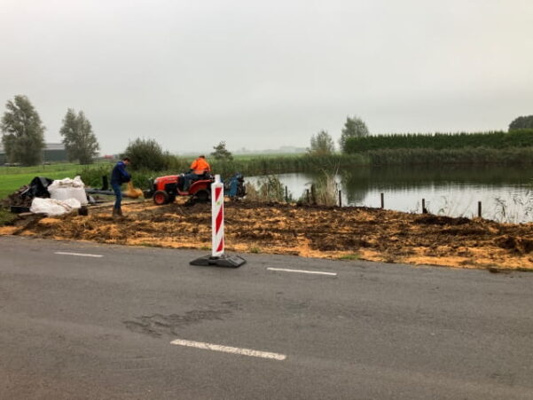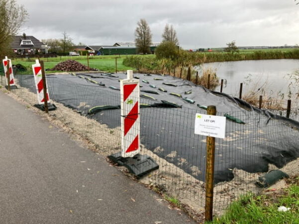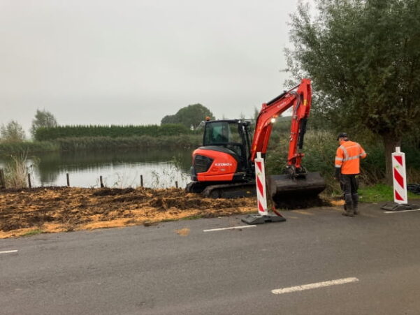De uitdaging bij deze spot? Zorgen voor een volledige, luchtdichte afdekking. Daarvoor brachten we een tijdelijke beschoeiing aan in het water. Aan de wegkant ontgroeven we de bodem voorzichtig tot aan de weg, zonder de ondergrondse kabels en leidingen te raken. Met palen, gaas en verkeersschilden is de spot afgezet en voorkomen we dat auto’s per ongeluk de afdichting kapot rijden.