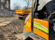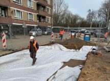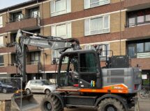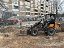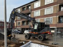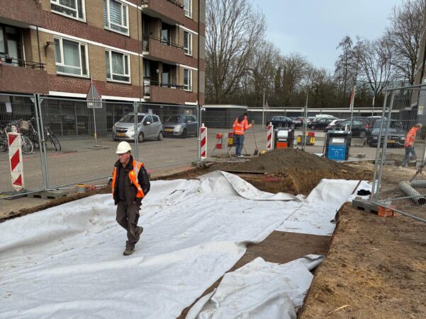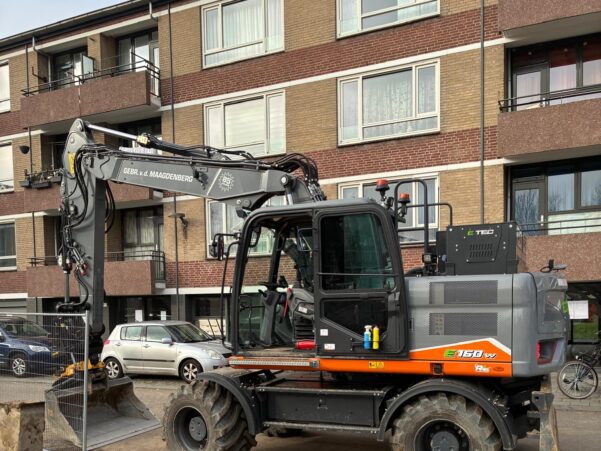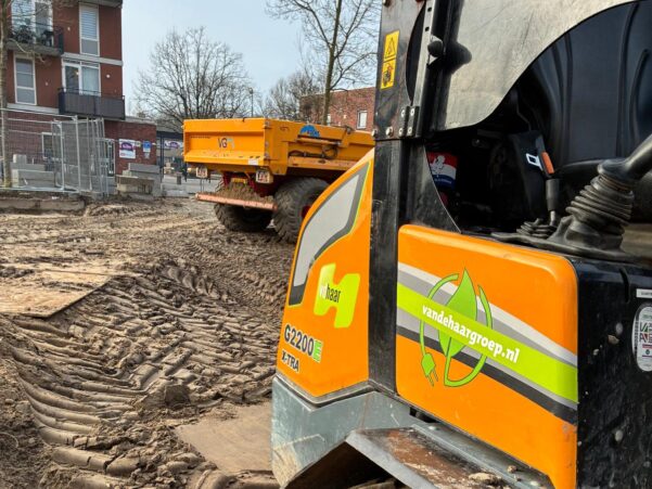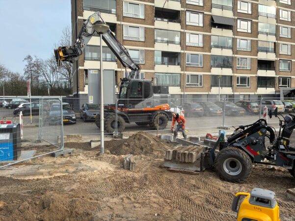 Bijzonder aan dit werk? We voeren het bijna emmissieloos uit. Zo zetten we een elektrische mobiele kraan in voor het grondverzet, gebruiken we een elektrische shovel en trilplaat voor het straatwerk en bandenzagen, stampers en ander gereedschap op een accu. We laden de voertuigen en gereedschappen op locatie, zodat er minder transport nodig is voor dit werk.